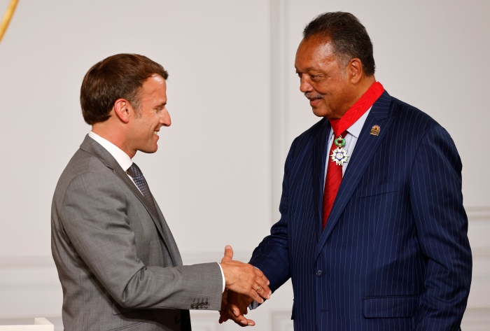 French President Emmanuel Macron (L) shakes hands with American civil rights activist Reverend Jesse Jackson (R) after awarding him with the Legion of Honour at the Elysee Palace in Paris, France, on July 19, 2021.
