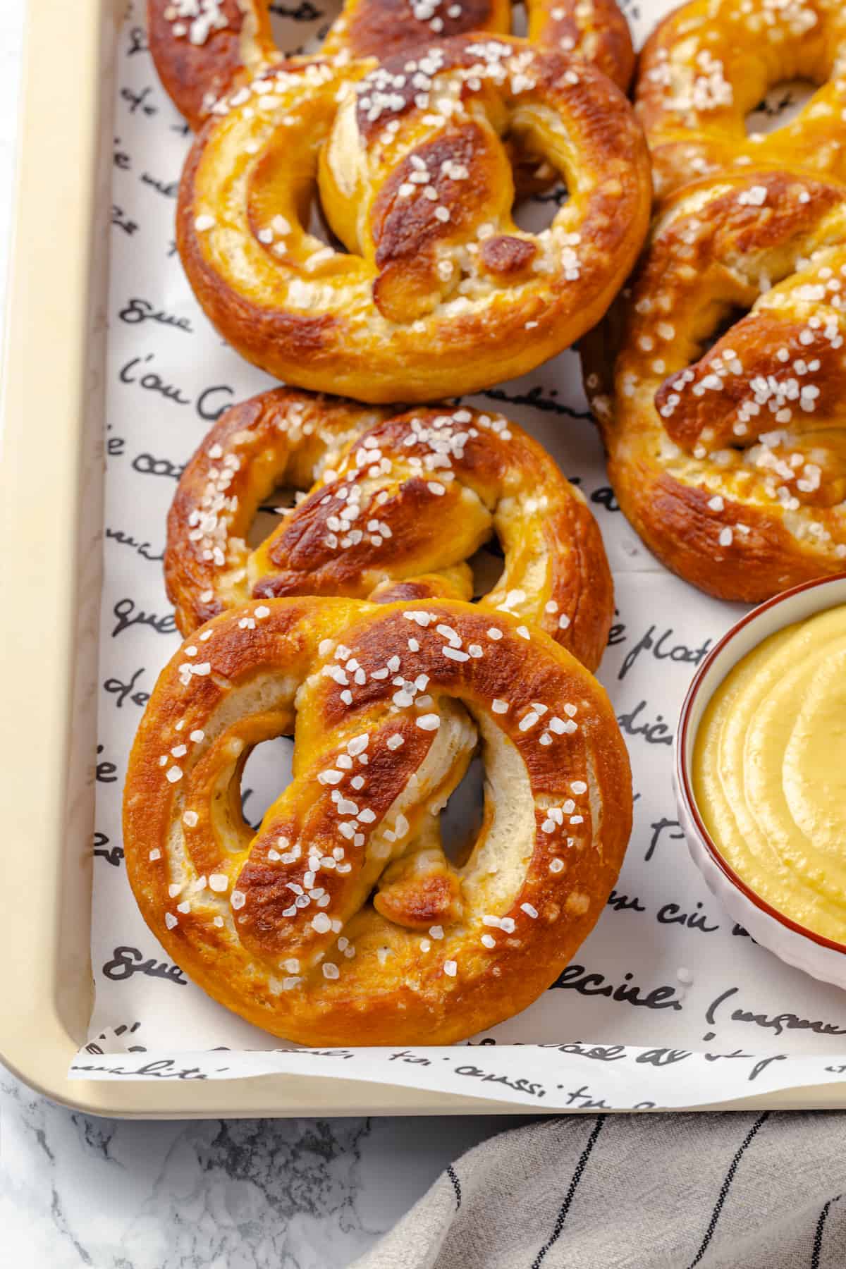 If you happen to have any leftovers after making this soft pretzel recipe, store them in an airtight container at room temperature for up to 2 days.