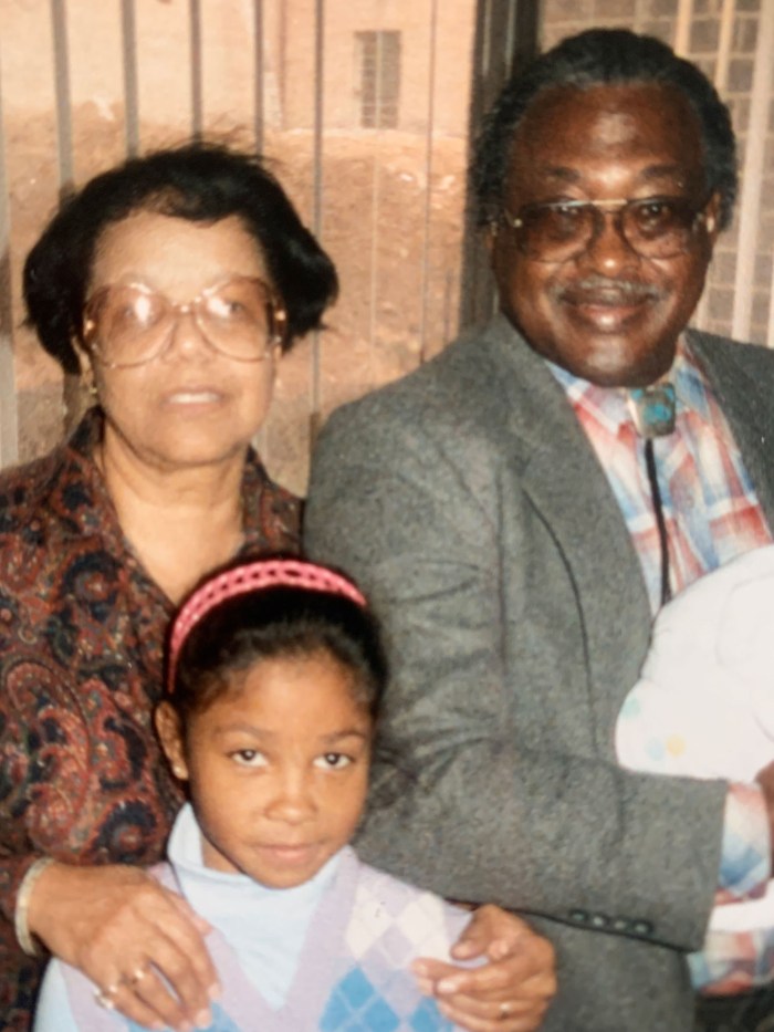 Umme Salim-Beasley (center) as a child with her grandmother Catherine Hawkins (left) and her grandfather Reginald Hawkins (right).
