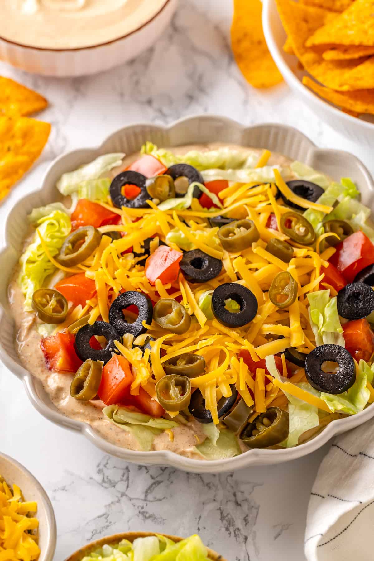 - Assemble. Transfer the dip to a serving bowl. Top it with the iceberg lettuce, vegan cheddar cheese, tomato, green chilis, and black olives.