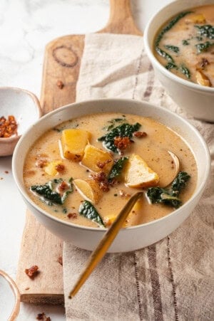 Zuppa toscana is creamy and hearty with tender potatoes and kale, and this vegan version is just as tasty as the Olive Garden original!