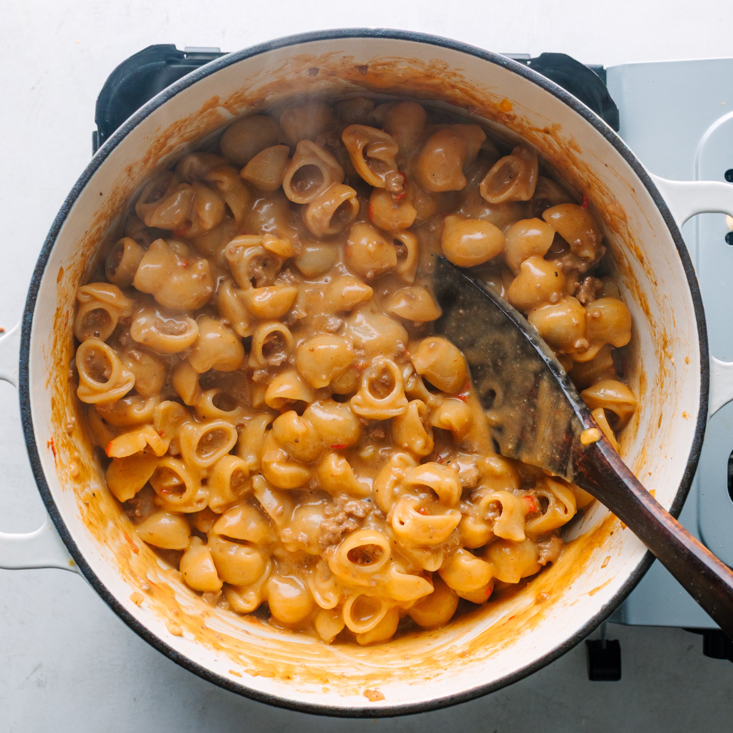 Cook the pasta: Add the pasta and mix it into the meat and vegetables. Pour in the beef broth to cover the pasta and stir. Bring the pot to a boil, then cover with a lid. Reduce the heat to low and simmer, stirring occasionally, for 11–15 minutes or until the pasta is tender.
