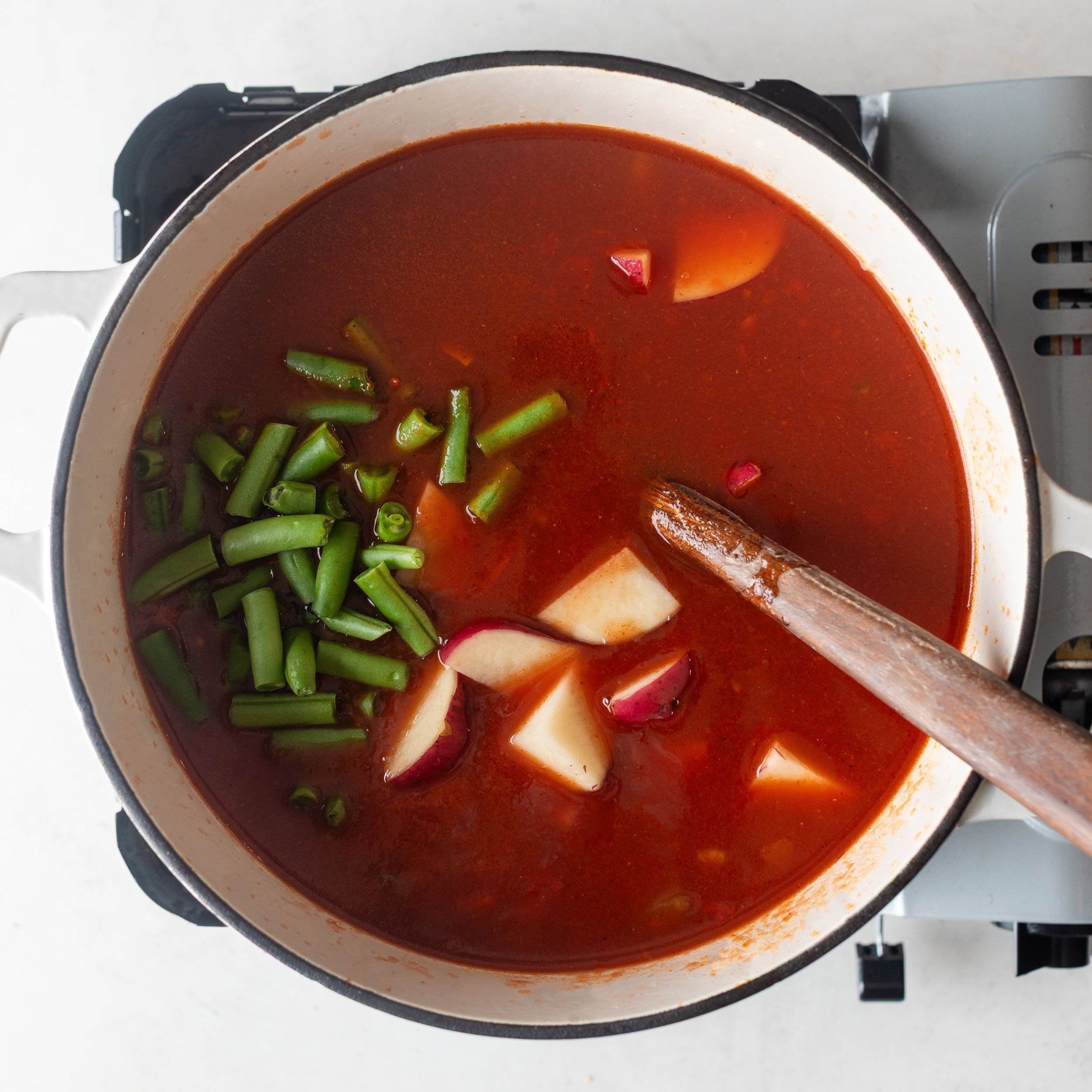 Step 4: Pour in beef broth, then add potatoes, green beans, crushed tomatoes, and tomato sauce. Bring to a boil, then reduce to a gentle simmer until potatoes are nearly tender.