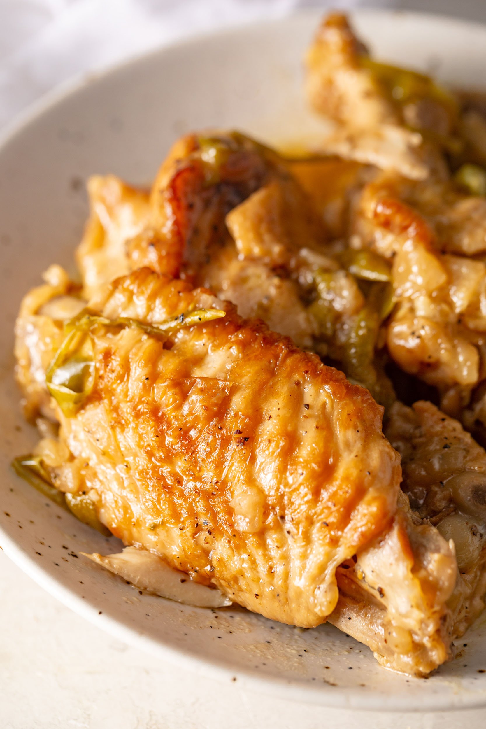 The wings are cooked in one pan and smothered in homemade gravy made with onions, bell peppers, butter, and seasonings. The gravy is savory and flavorful, you’ll want to pour it over rice or serve up mashed potatoes with gravy.
