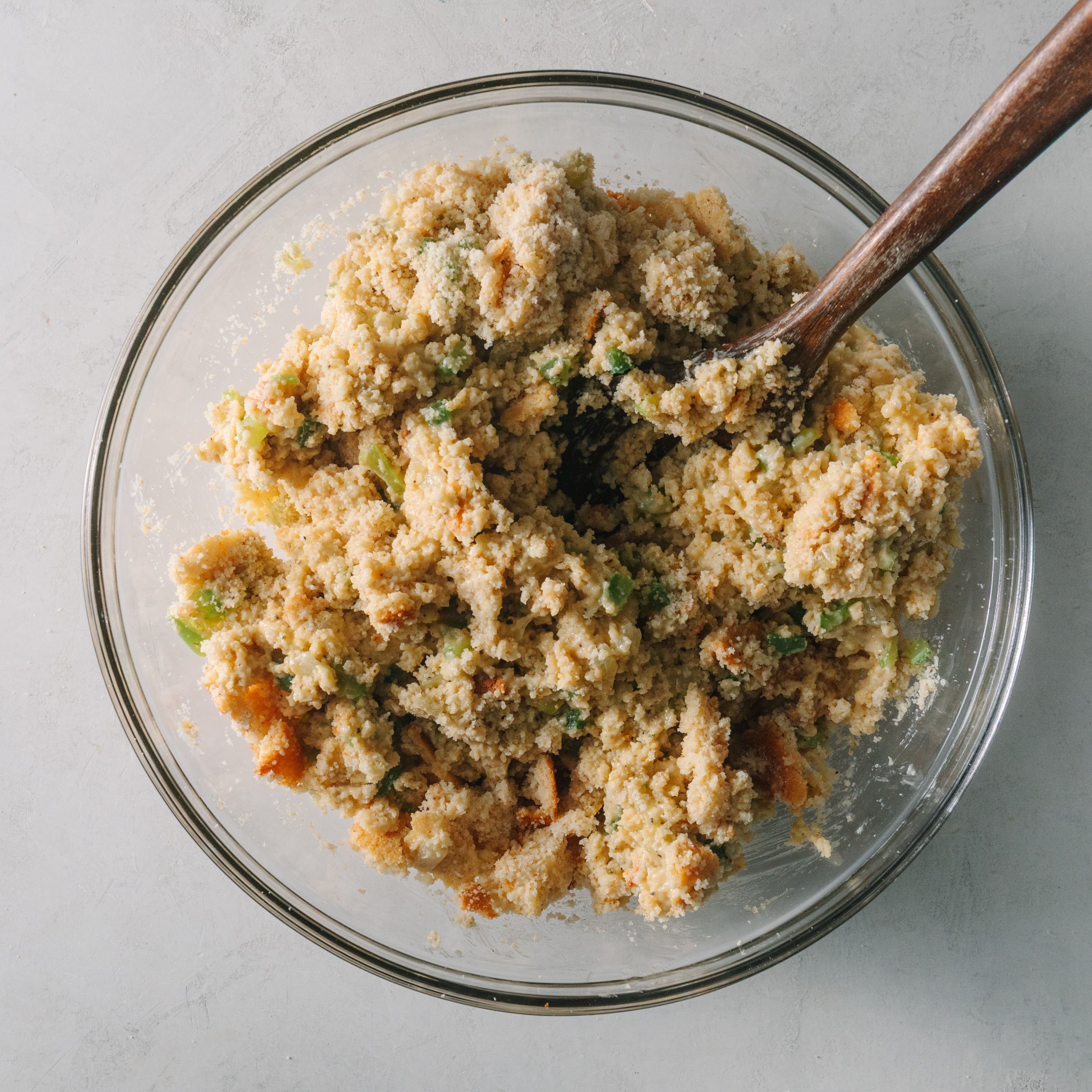 Gradually pour in chicken broth, stirring until the mixture is moist but not soupy. Add a little extra broth if you like your dressing extra moist.