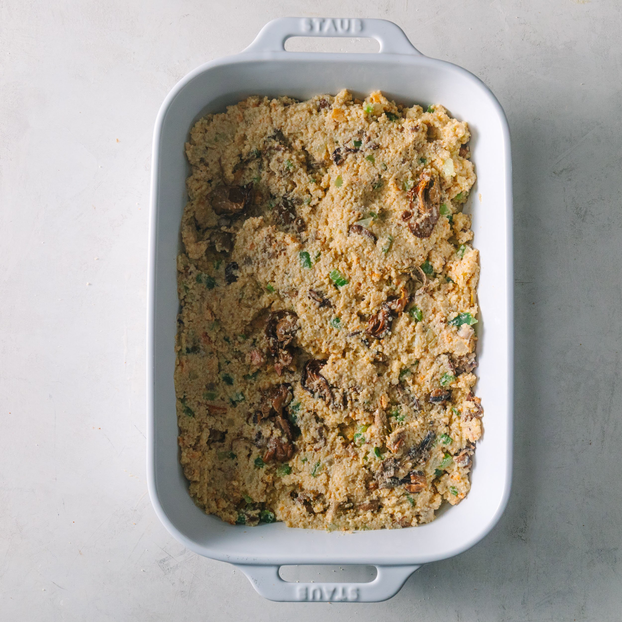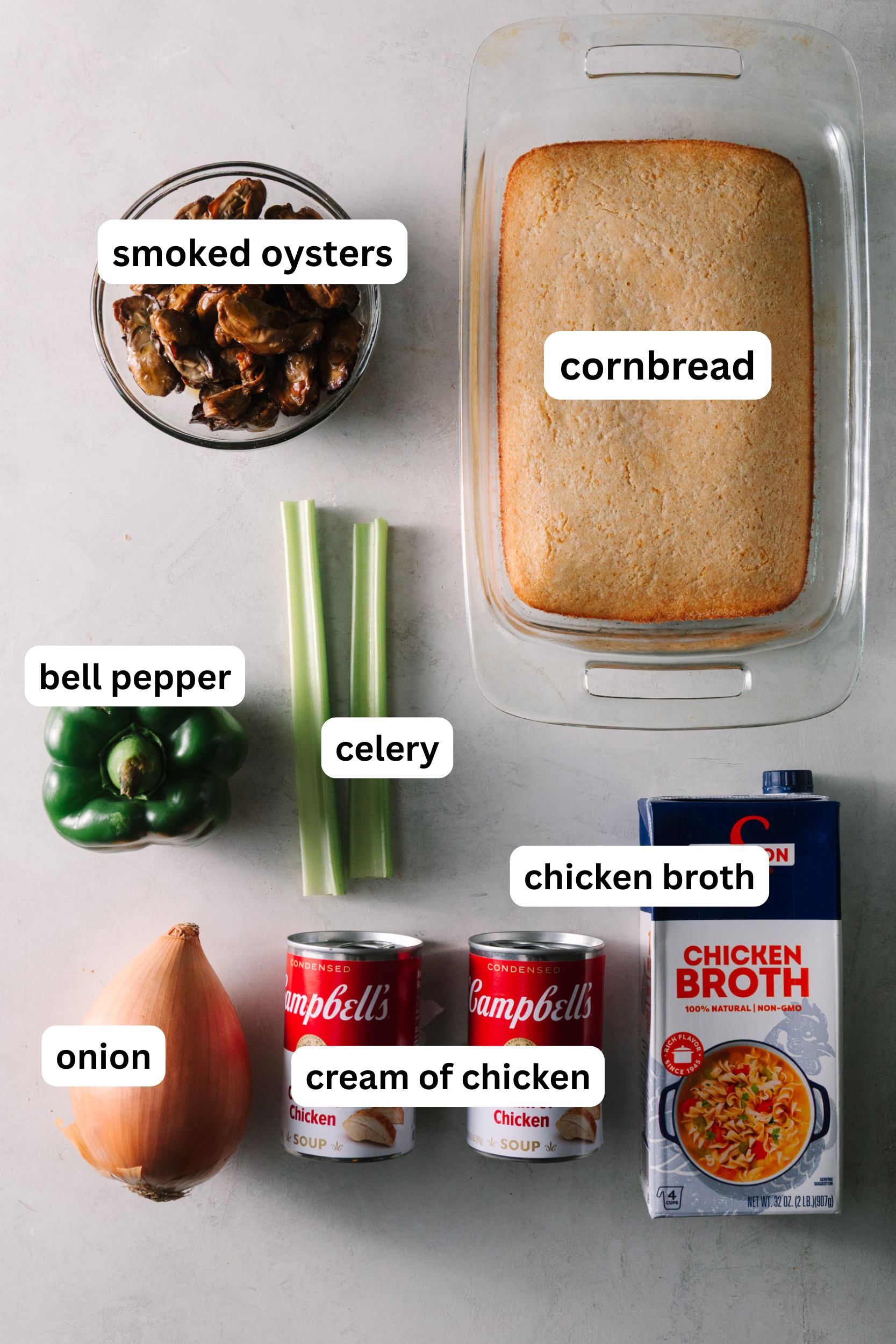 - Cornbread: Use homemade cornbread that’s been baked and cooled. Day-old cornbread works best because it absorbs the broth without falling apart. We used the recipe on the back of the White Lily cornmeal bag because it’s simple, reliable, and not too sweet.