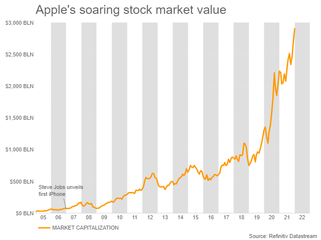 The iPhone maker’s value tripled since 2018 as its sales continued to soar and it spent hundreds of billions of dollars on its own stock.