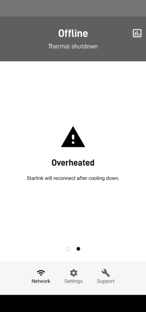 A Starlink beta user in Arizona said he lost Internet service for over seven hours yesterday when the satellite dish overheated, demonstrating one of the drawbacks of SpaceX’s broadband service. When the user’s Internet service was disrupted, the Starlink app provided an error message saying, “Offline: Thermal shutdown.” The dish “overheated” and “Starlink will reconnect after cooling down,” the error message said.